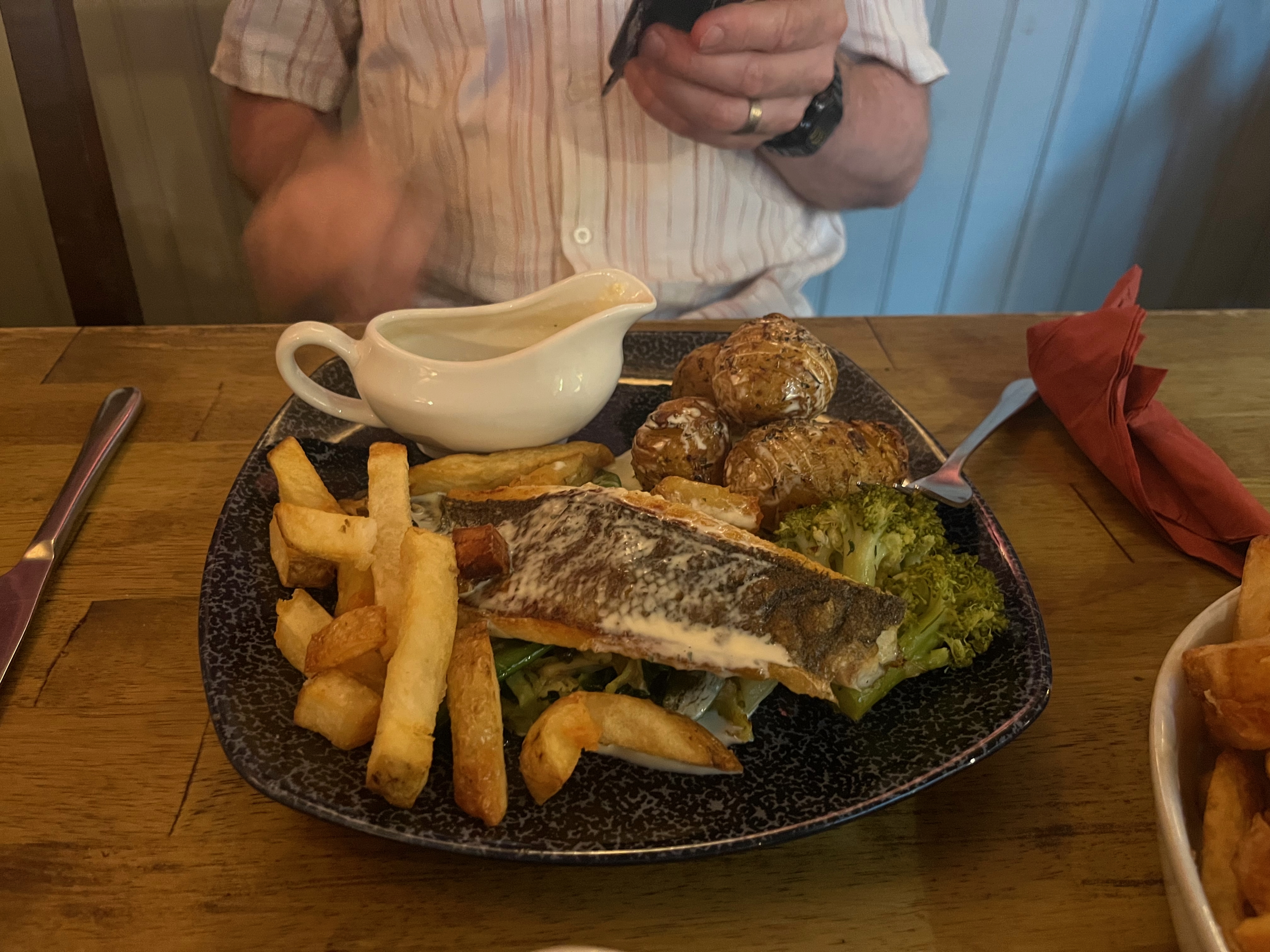 We changed our ferry booking from 2 AM to 2:30 PM. I met Seamus at the port, and we made the crossing. We then enjoyed a lovely dinner at the Gladstone pub near Penmaenmawr, followed by a night at Seamus’s friends’ house.