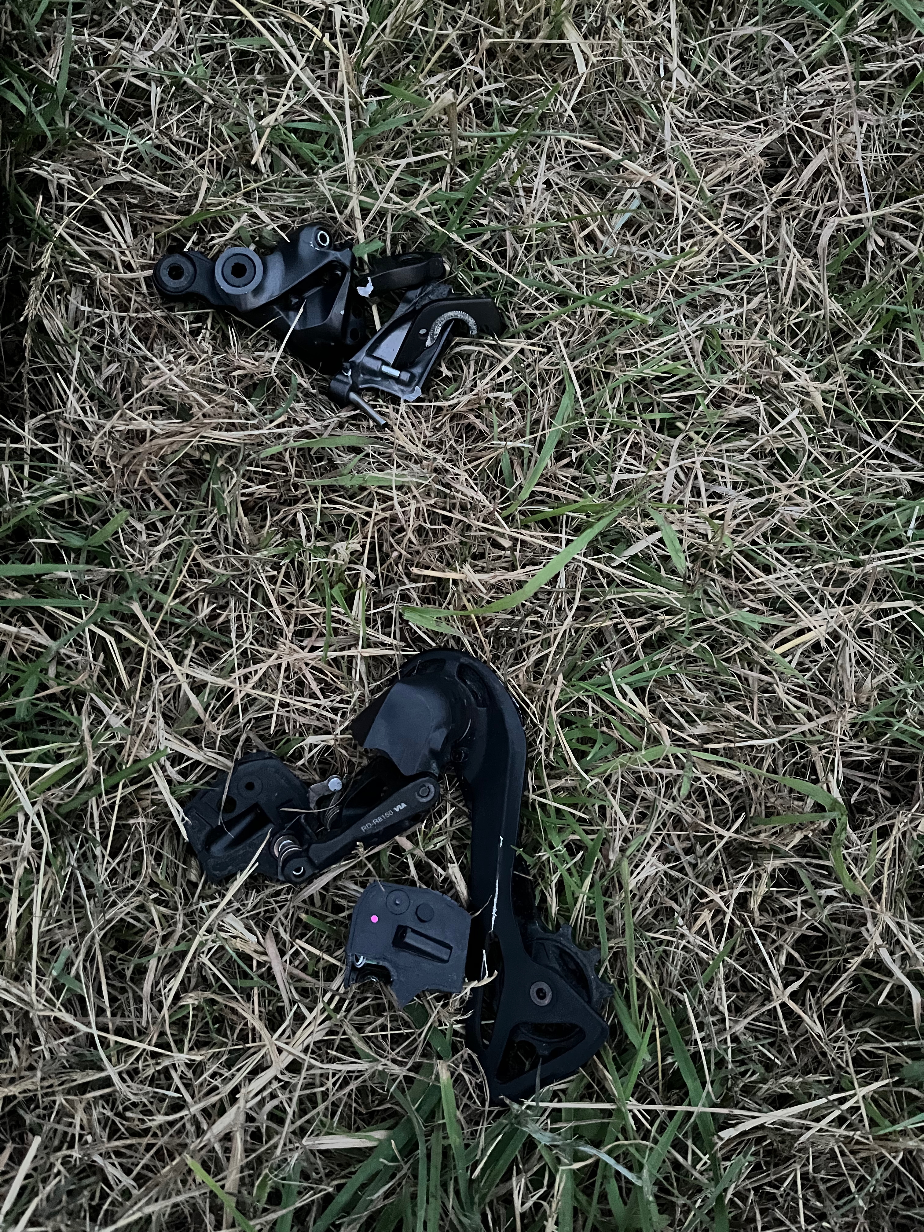 It was around this precise moment that I heard a loud bang. I turned back and saw two people I hadn’t previously noticed in the group hitting the ground. Then, in slow motion, I saw a front wheel lodged between my rear Di2 derailleur and my wheel. My brain registered: ‘Oh, this isn’t good.’ I tried to control the bike and stay upright, somehow managing to avoid hitting the asphalt myself. I attempted to restart pedaling, but something felt distinctly off. I pulled over to the side of the road to check, and then it hit me: my derailleur was… gone. Vanished. Poof. Just like my hopes of finishing LEL.