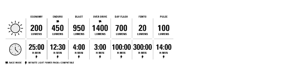 The front lights were set up to run in “race mode,” meaning only two modes were available: high beam and low beam. The low beam lasts an impressive 12 hours and 30 minutes!