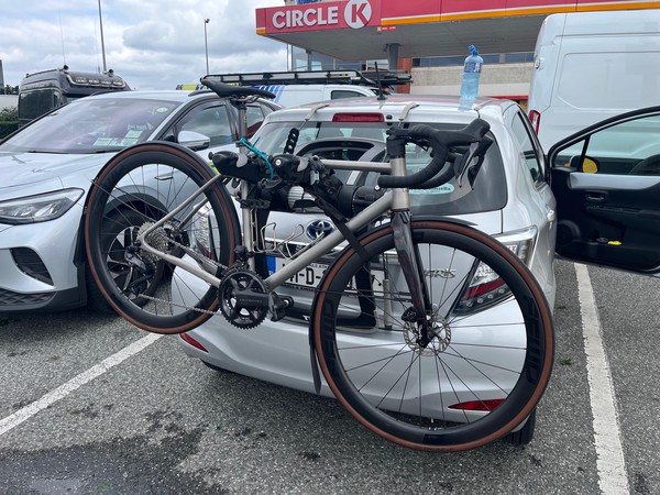 I rode my new Mason Aspect Integrale. I had given it a test ride at the Celtic Knot 1000 and was very happy with its performance. The drivetrain was Shimano Di2 Ultegra, with a compact gearing setup. The wheels were FFWD RYOTT 44. I love these wheels; they feature external brass nipples and DT Swiss 240 hubs with a ratchet system. I had mounted Pirelli P-Zero Race TLR 30mm tires and carried a spare (non-tubeless) one with me, strapped to the Tailfin bridge. The bike had permanent mudguards (I live in Ireland, after all!), from Portland Design Works.