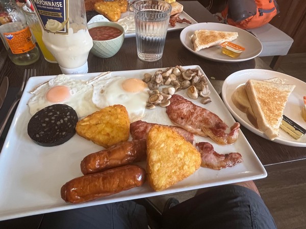 We changed our ferry booking from 2 AM to 2:30 PM. I met Seamus at the port, and we made the crossing. We then enjoyed a lovely dinner at the Gladstone pub near Penmaenmawr, followed by a night at Seamus’s friends’ house.